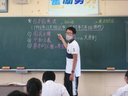 日本国憲法について 3−1社会 公開日 2022/07/05 更新日 2022/07/05 学び合い認め合う学習 7月5日(火) 2限 3−2社会の授業風景です。日本国憲法について学習しています。「国民主権、平和主義、基本的人権の尊重」等。