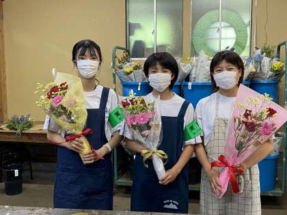 「社会に学ぶ『14歳の挑戦』」営農サポートセンター、きたのフラワーガーデン 公開日 2022/07/07 更新日 2022/07/07 生徒の活動紹介 営農サポートセンターでは、菊のお世話を手伝っていました。 きたのフラワーガーデンでは、花束作りに挑戦! きれいな花に見合う、素敵な笑顔ですね♪
