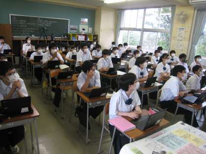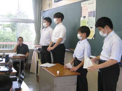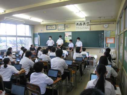 「社会に学ぶ『14歳の挑戦』」発表会 その1 公開日 2022/07/12 更新日 2022/07/12 学び合い認め合う学習 7月12日(火) 6限 総合 2年生が14歳の挑戦の発表会を行いました。事業所別のグループで、職場体験に関する感想やこれからの目標に向けての意見を述べました。