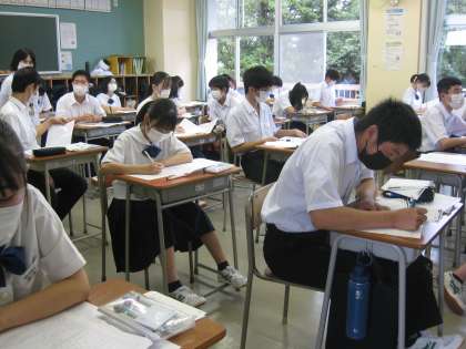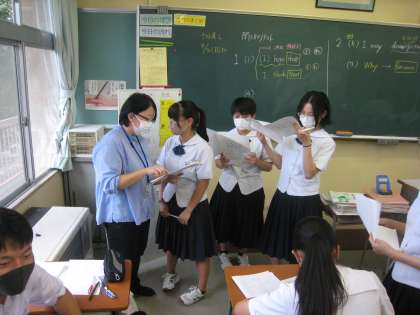 3−1テ英語の授業風景です。先日行われた夏休み明けテストが返されて見直しをしています。分からないところはどんどん先生に質問しましょう!