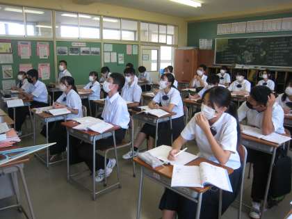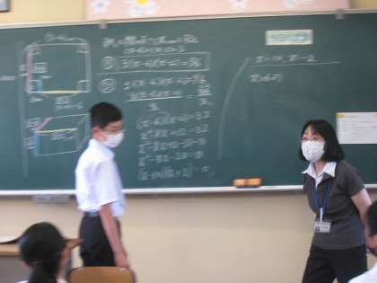 3−1数学の授業風景です。二次方程式について学習しています。先生が分かりやすく説明をして、生徒が熱心に聞いています。がんばれ!