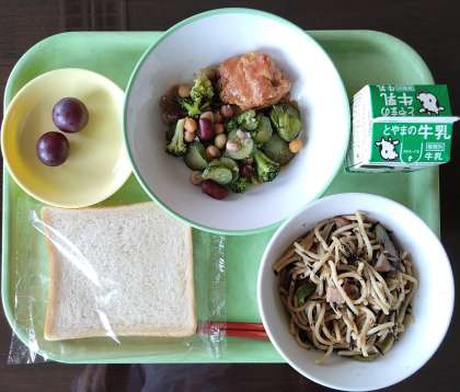「照焼きチキン」は柔らかくジューシー、「ビーンズサラダ」は数種類の豆が野菜と見事にマッチング、「ベーコンとひじきの和風スパゲッティ」は食材が引き立つ食べやすい味付け、「巨峰」は甘さバツグンで、今日も『おいしい給食』を楽しくいただくことができました。感謝・・・。