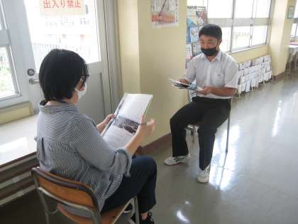 音読テストをしています 3−1英語 公開日 2022/09/15 更新日 2022/09/15 学び合い認め合う学習 9月15日(木) 2限 3−1英語の授業風景です。廊下で一人ずつ音読テストをしています。どの生徒も発音がとても自然ですばらしかったです。