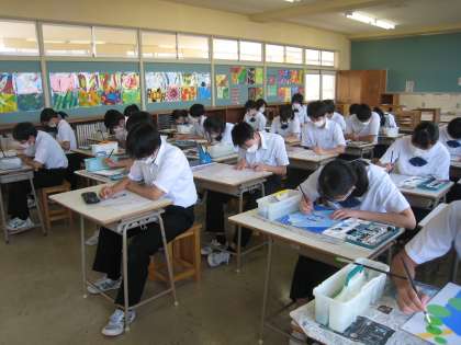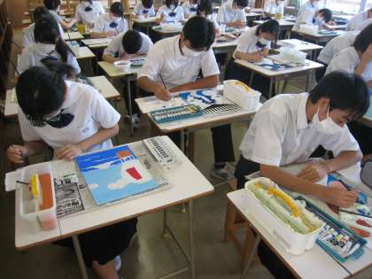 3−2美術の授業風景です。デザイン画「立体感のある平面構成」の色塗りをしています。幾何形体の絵をポスターカラー絵の具でていねいに塗っています。