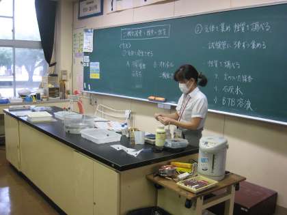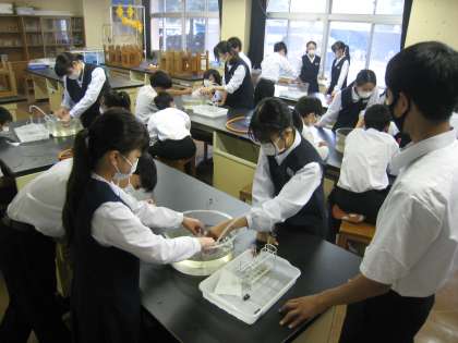 1−2理科の授業風景です。理科室で酸素や二酸化炭素等の気体に関する実験をしています。試験管から出た気泡を手で集めています。みんなうまくできたかな?