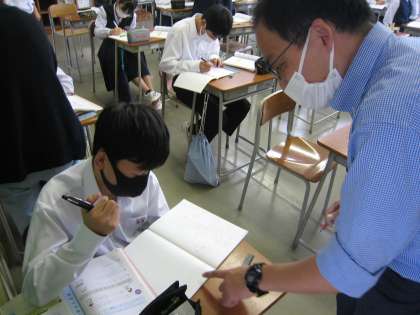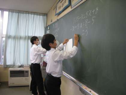 式の計算 1−1数学 公開日 2022/10/05 更新日 2022/10/05 学び合い認め合う学習 10月5日(水) 5限 1−1数学の授業風景です。生徒が黒板で式の計算をしています。先生に積極的に質問もしていました。中間テストに向けてがんばろう!