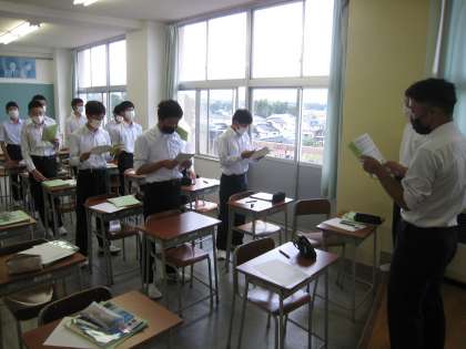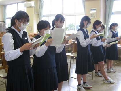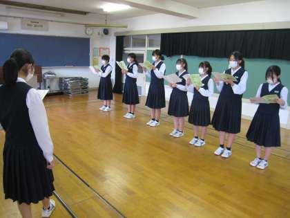 合唱コンクールに向けた練習 3−1音楽 公開日 2022/10/05 更新日 2022/10/05 学び合い認め合う学習 10月5日(水) 5限 3−1音楽の授業風景です。合唱コンクールに向けた練習をしています。課題曲は名曲「心の瞳」です。コロナ感染予防対策で、音声パートごとに教室を分けています。中学校最後の合唱を最高のものにしよう!