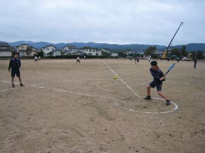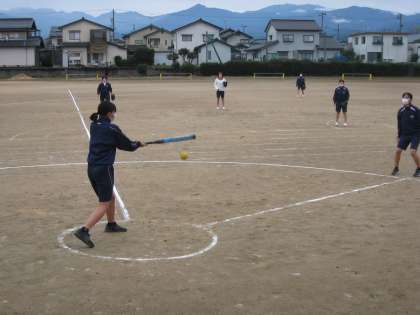3−1体育の授業風景です。ソフトボールの試合をしています。みんな大分上達してきました。ホームランに近いバッティングもありました。すごい!