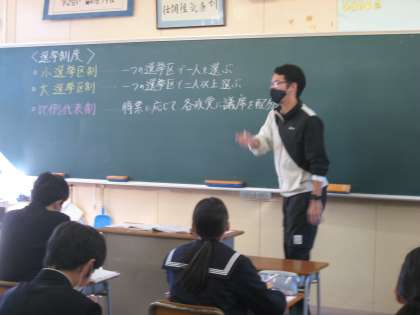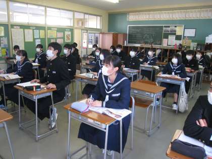 3−2社会の授業風景です。3−1と同じく、社会科の確認テストの見直しをしています。先生の熱い指導が、生徒のやる気に火を灯しています!がんばれ!3年生!!