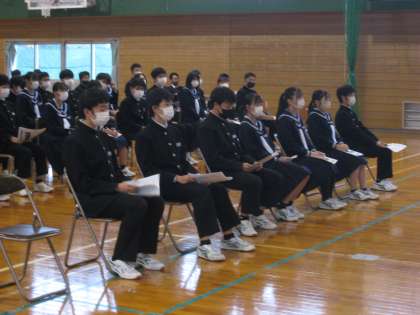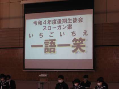 後期生徒会スローガンは『一語一笑(いちごいちえ)』です。「一期一会」という四字熟語を基に「挨拶等の言葉」や「笑顔」を大切にしてほしいという想いを込めて掲げられました。たった一つの言葉でも、人を笑顔にすることができます。互いに思いやりの心をもち、みんなが笑顔で充実した学校生活が送れるよう、がんばっていきましょう!