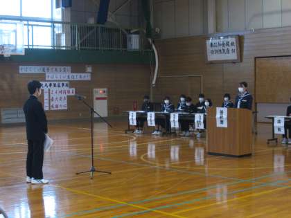(写真上:新生徒会スローガン 中:質疑応答 下:質問者の生徒)