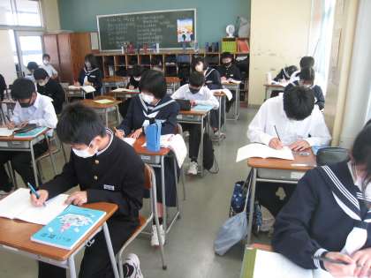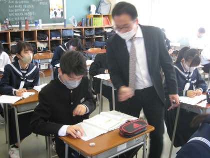 1−1数学の授業風景です。比例のグラフについて学習しています。担当の先生が一人一人の様子を見ながら、個別に解説しています。みんながんばって!