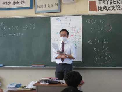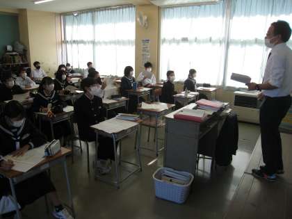 1−1数学の授業風景です。先日行われた中教研テストが返却され、その解説が行われました。テストは終わった後が大切。間違えてしまったところは、今しっかりと覚えておきましょう。