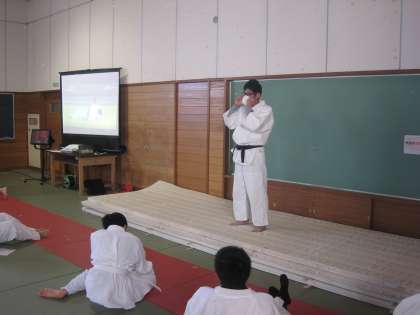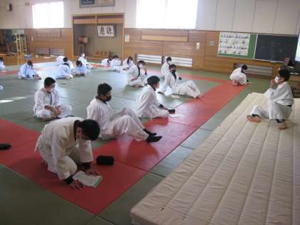 3−1体育の授業風景です。明志館(武道場)で、柔道の授業をしています。担当の先生から、相手から技をかけられた時の防御の仕方を教わっています。
