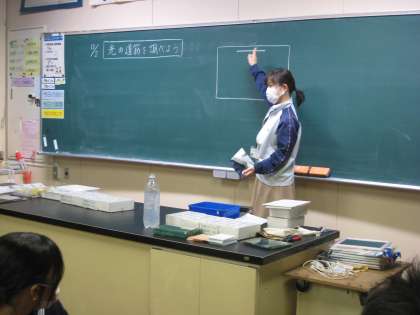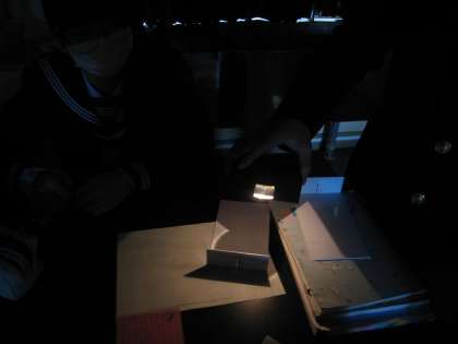 光の道すじについて 1−1理科 公開日 2022/12/02 更新日 2022/12/02 学び合い認め合う学習 12月2日(金) 2限 1−1理科の授業風景です。光の道すじについて学習しています。理科室を暗くして、光の反射や屈折をいろいろと試しています。