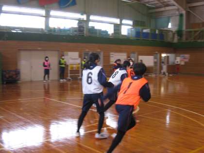 バスケットボールの試合 3−2体育 公開日 2022/12/20 更新日 2022/12/20 学び合い認め合う学習 12月20日(火) 3限 3−2体育の授業風景です。バスケットボールの試合をしています。互いに声を掛け合い、連係プレーでがんばっています!