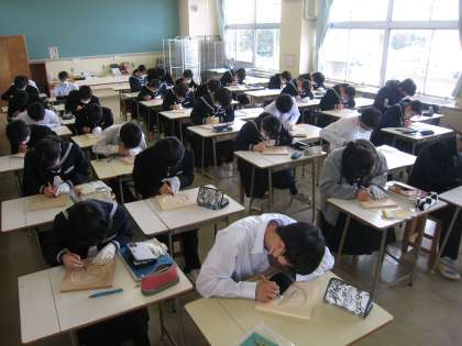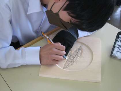 2−1美術の授業風景です。木彫レリーフを制作しています。自分で選んだ葉っぱを彫刻刀で本物のように彫っています。制作中の集中力がすばらしい!