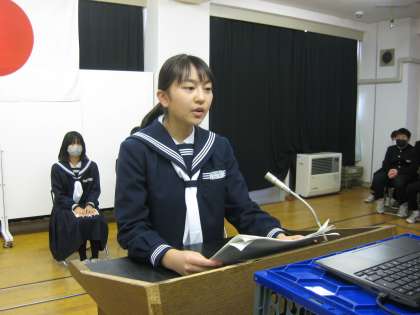 意見発表 公開日 2022/12/23 更新日 2022/12/23 その他 12月23日(金) 各学年の代表生徒が今学期をふり返り、意見発表を行いました。3人とも自分の思いや願いを込めた、たいへんすばらしい発表でした。来学期も月中みんなでがんばりましょう!! (写真上:3年生代表 中:2年生代表 下:1年生代表)