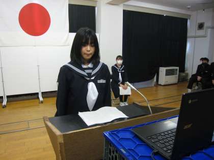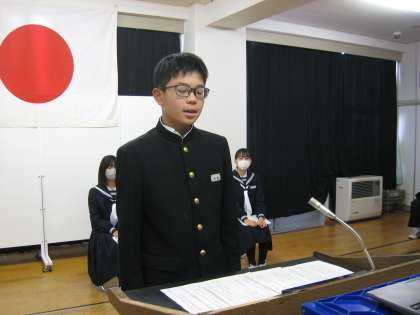 意見発表 公開日 2022/12/23 更新日 2022/12/23 その他 12月23日(金) 各学年の代表生徒が今学期をふり返り、意見発表を行いました。3人とも自分の思いや願いを込めた、たいへんすばらしい発表でした。来学期も月中みんなでがんばりましょう!! (写真上:3年生代表 中:2年生代表 下:1年生代表)