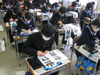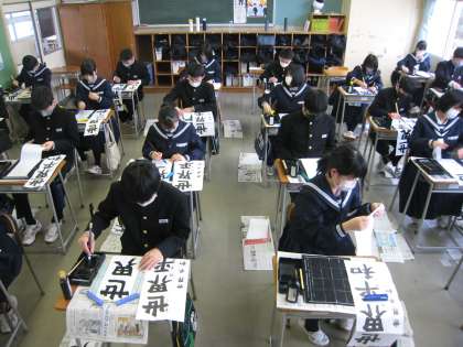 書き初め大会(1学年) 公開日 2023/01/10 更新日 2023/01/10 学び合い認め合う学習 1月10日(火) 2限 1学年の書き初め大会の様子です。課題語句は「世界平和」。みんな真剣に書いています。(写真上:1−1 下:1−2)