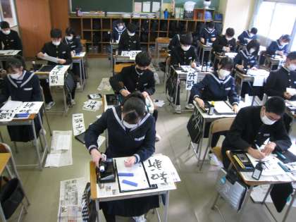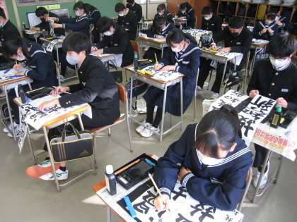 書き初め大会(3学年) 公開日 2023/01/10 更新日 2023/01/10 学び合い認め合う学習 1月10日(火) 2限 3学年の書き初めの様子です。課題語句は「温故知新」。最上級生の作品はさすがにレベルが高いです。(写真上:3−1 下:3−2)