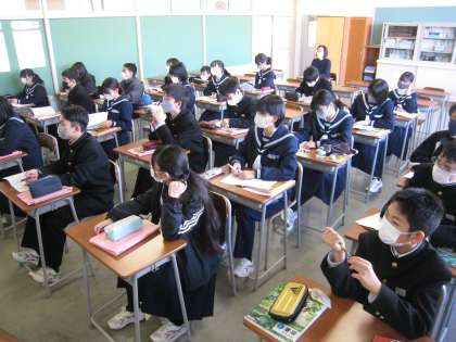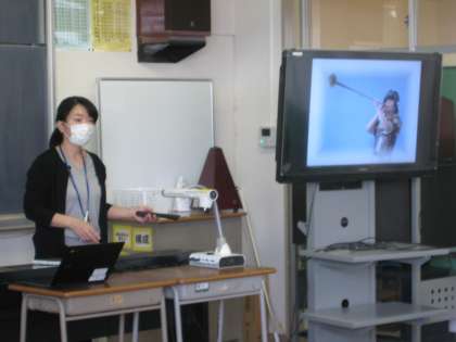1−1音楽の授業風景です。オーケストラの音色について学習しています。いろいろな音色を聴いて、どの楽器で演奏されているか考えています。