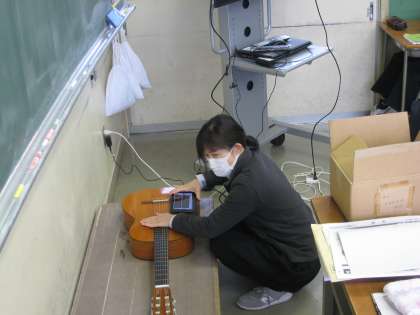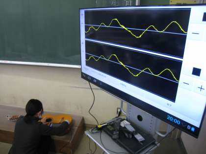 音の波形 1−1理科 公開日 2023/01/16 更新日 2023/01/16 学び合い認め合う学習 1月16日(月) 1限 1−1理科の授業風景です。ギターの弦をはじいて、その音をコンピュータで波形にして見ています。見えないものを見る・・・不思議ですごい!