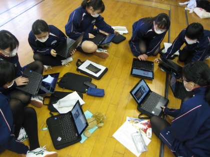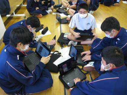 3−2体育の授業風景です。動画を見ながら、どんなダンスを踊るかチームで考えています。今から楽しみです!