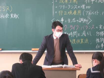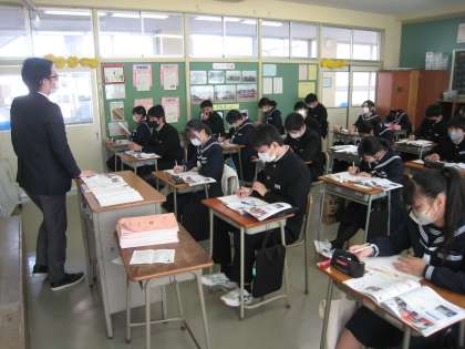 3−1社会の授業風景です。企業のあり方について学習しています。社会貢献や環境保護に力を入れている企業が最近増えているそうです。