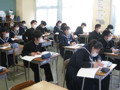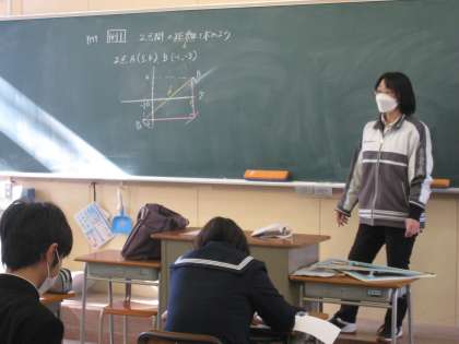 3−2数学の授業風景です。三平方の定理を使って平面の辺の長さを求めています。みんな真剣に問題を解いています!