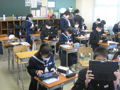 3−2技術の授業風景です。パソコンを使ってコマ撮りアニメを制作しています。とてもユニークな内容になりそうです。楽しみ!