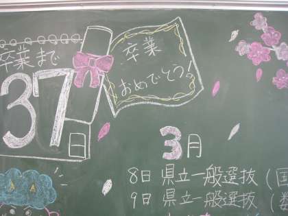 卒業まであと37日 3年 公開日 2023/01/20 更新日 2023/01/20 その他 1月20日(金) 3年生教室の背面黒板に書かれています。「卒業まであと37日」。クラスの友達との思い出を大切につくっていきましょう。