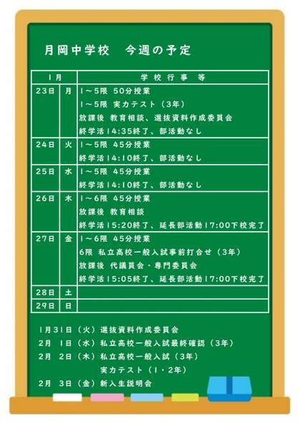 また、3年生はいよいよ受験シーズンに入りました。ベストコンディションで自分の力を発揮することが成功へとつながります。これまでと同様、新型コロナウィルスやインフルエンザウィルスに対する感染防止対策にみんなで取り組んでいきましょう。