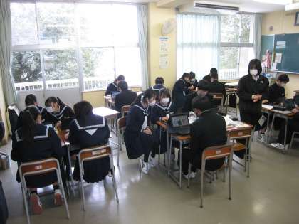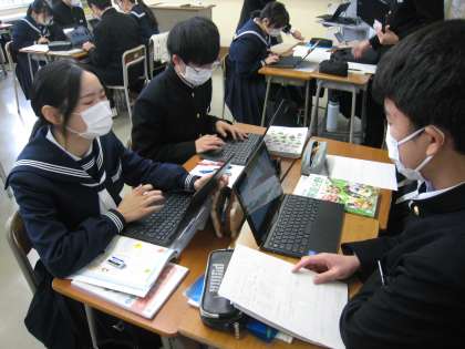 3−1家庭科の授業風景です。消費の仕方に関する学習をしています。インターネットで商品を購入する際に気を付ける点を確認しています。