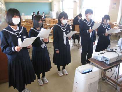 卒業式の歌唱練習 1−1音楽 公開日 2023/02/17 更新日 2023/02/17 学び合い認め合う学習 2月17日(金) 2限 1−1音楽の受業風景です。卒業式に歌う合唱をパート別に練習しています。お世話になった3年生の先輩方へ感謝の気持ちを込めて歌いましょう。