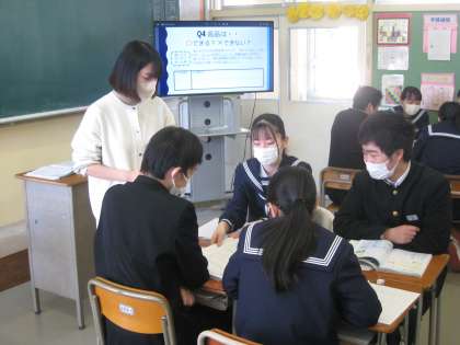 3−1家庭科の授業風景です。契約と消費生活について学習しています。契約に関するトラブルに巻き込まれないためにはどうしたらよいかをグループで考えています。