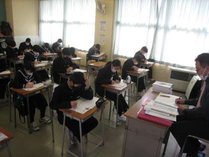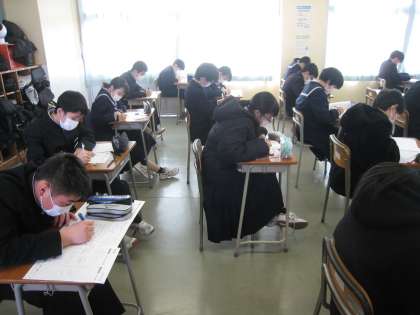 1−2数学の授業風景です。学年末考査前に確認テストを行っています。がんばれ1年生!