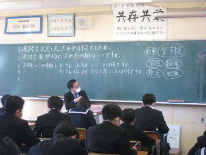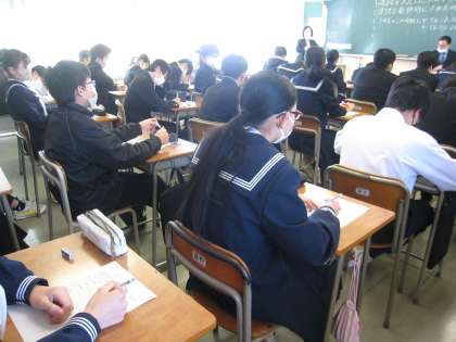2−1総合的な学習の授業風景です。進路学習の「高校調べ」を行っています。自分が将来どのような道に進みたいのかを考えながら、それぞれの高校の特徴について調べていきます。