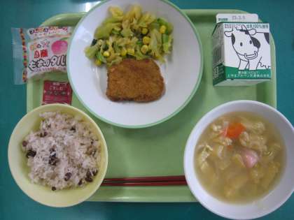 今日の給食 公開日 2023/03/02 更新日 2023/03/02 その他 3月2日(木) 今日の給食メニューは、 ・赤飯 ・牛乳 ・とんかつ ・コーン和え ・紅白白玉汁 ・もものタルト ・ごま塩 です。 卒業のお祝い給食です。とても豪華でどのメニューもおいしかったです。