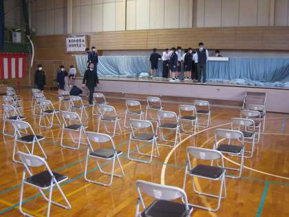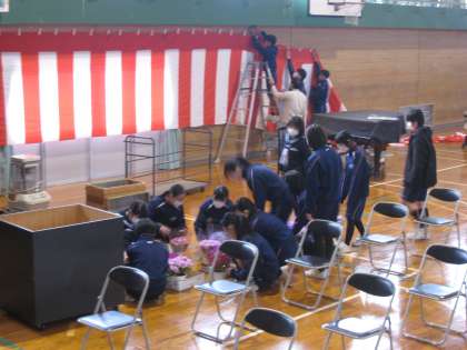卒業式会場準備 公開日 2023/03/13 更新日 2023/03/13 その他 3月13日(月) 放課後 2年生を中心に卒業式に向けた準備をしています。明日は同窓会入会式、育友会記念贈呈式が行われます。その後は卒業式予行練習です。月中みんなで気持ちを高めていきましょう。