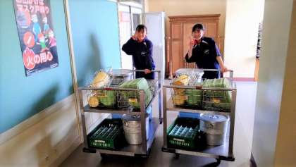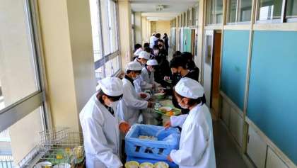 4限終了後の35分間、クラス全員で協力しながら手洗い、準備、配膳、食事、片付けまでを行います。まだ机は前向きですが、小さな声での会話と、広報委員会のお昼の校内放送「イッツ、ランチタイム!」を聴きながら、おいしい給食を楽しくいただいています。