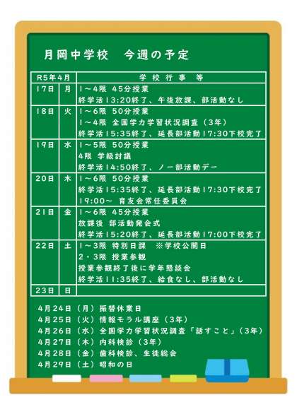 今週の予定 公開日 2023/04/18 更新日 2023/04/18 週案 4月17日(月)〜4月23日(日)の予定です。 今週は22日(土)が学校公開日となるため、6日間の登校となります。部活動の発会や生徒総会に向けた準備が進められるとともに、1〜3年生のすべての授業が本格的に始動します。