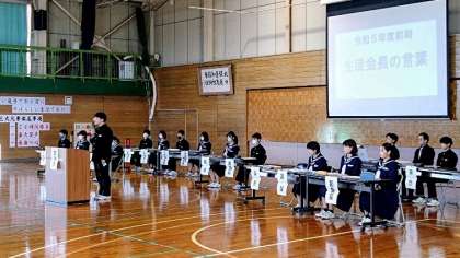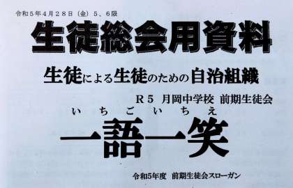 本日5限・6限に令和5年度前期生徒総会を行いました。まず、生徒会規約の改定についての提案と決議があり、その後、前期活動計画案についての議事へと進みました。提案するリーダーとそれを受けとめるフォロワーが、「輝き続ける月岡中学校」でありたいという共通の思いをもって議論を交わすことができた素晴らしい生徒総会でした。