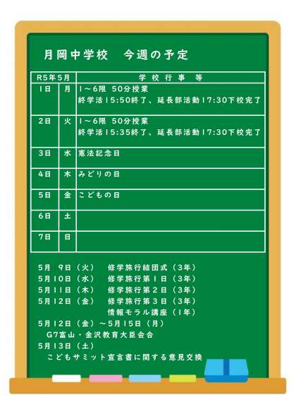 5月の第1週はゴールデンウィークとなります。2日間の学校生活を丁寧に送り、連休中の家庭生活へとつなげましょう。また、3年生は修学旅行1週間前となります。健康管理にも十分に気を配りましょう。