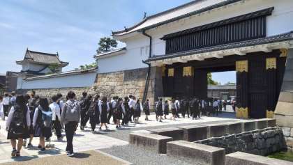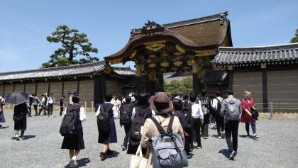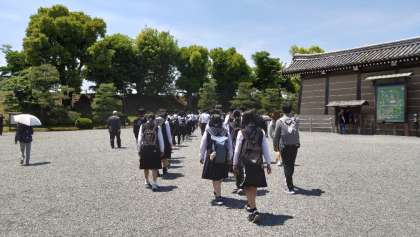 5月10日(水)修学旅行 −二条城− 公開日 2023/05/10 更新日 2023/05/10 学び合い認め合う学習 車窓から東本願寺、京都タワー、西本願寺を見ながら、予定通り本日1つ目の見学地「二条城」に到着しました。