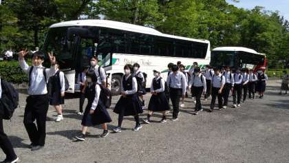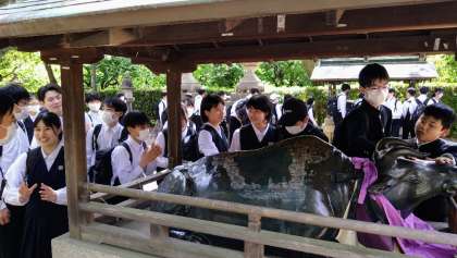 5月10日(水)修学旅行 −北野天満宮− 公開日 2023/05/10 更新日 2023/05/10 学び合い認め合う学習 本日3つ目の見学地「北野天満宮」に到着しました。ここでは全員が本堂に上がり、合格祈願と健康・安全祈願をしていただきました。 下足がきちんと揃えて入れられています。さすが月中生、素晴らしい!