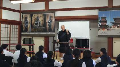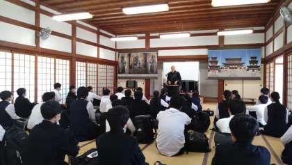5月12日(金)修学旅行 −薬師寺− 公開日 2023/05/12 更新日 2023/05/12 学び合い認め合う学習 お坊さんから講話をいただきました。ユーモアたっぷりのお話に、生徒たちは楽しく聞き入っていました。東塔の先端部には・・・、何と高岡銅器が使われているそうですよ。