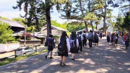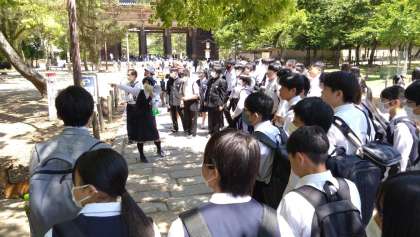 バスを降り、徒歩約15分で修学旅行最終見学地の「奈良公園」に到着しました。