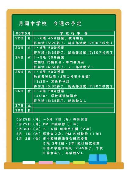 今週後半には、富山市教育委員会から教育長等が来校され、生徒の皆さんの頑張っている様子等を参観していかれます。また、月岡小中学校一体型のコミュニティ・スクールとして、第1回学校運営協議会が開催され、今年度の学校運営について委員の皆さんと協議を行います。