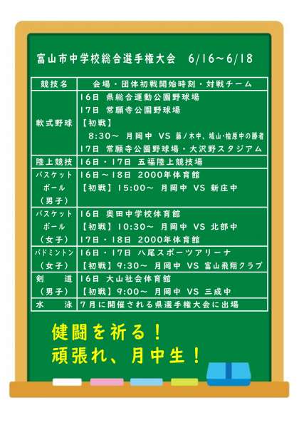 富山市中学校総合選手権大会 〜月岡中学校 試合日程〜 公開日 2023/06/15 更新日 2023/06/15 部活動 月岡中学校が出場する初戦の試合日程は、次の通りです。 皆さん、応援よろしくお願いします!